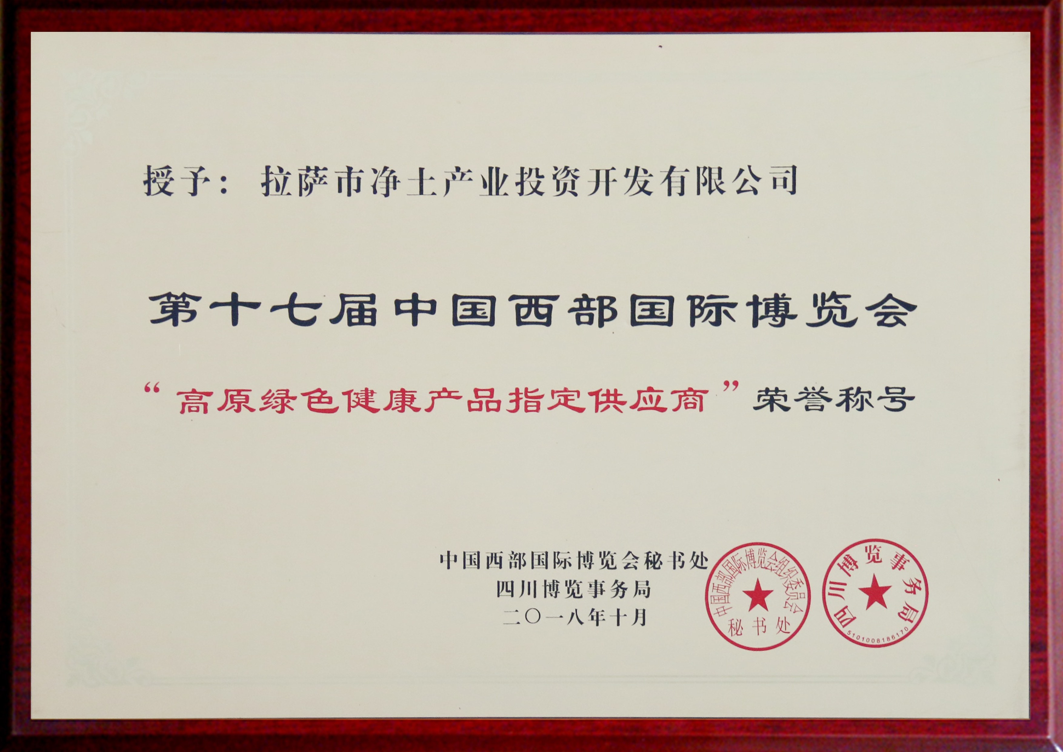 2018年第十七屆中國西部國際博覽會“高原綠色健康產(chǎn)品指定供應(yīng)商”榮譽(yù)稱號