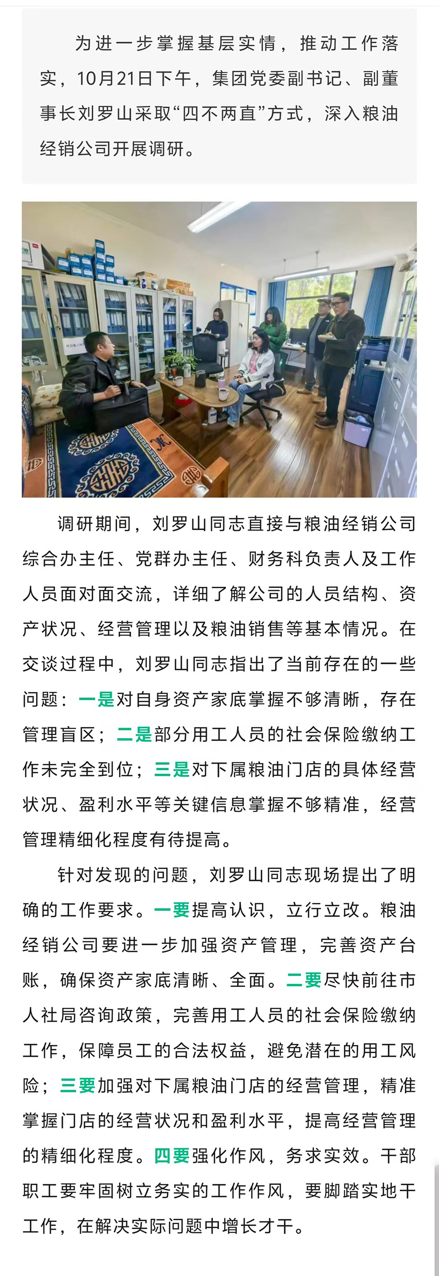 集團(tuán)黨委副書記以“四不兩直”方式深入糧油經(jīng)銷公司調(diào)研指導(dǎo)工作